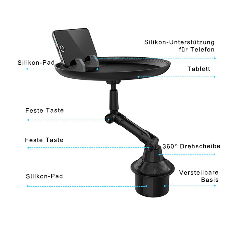 - Unser Car 360 ° Swivel Storage Tray ist mit einer 360 ° -Schwenkfunktion und einem Gelenkarm ausgestattet, mit dem Sie den Tisch in die perfekte Position bringen oder alternativ das Tablett zwischen Ihnen und dem Passagier hin und her drehen können.