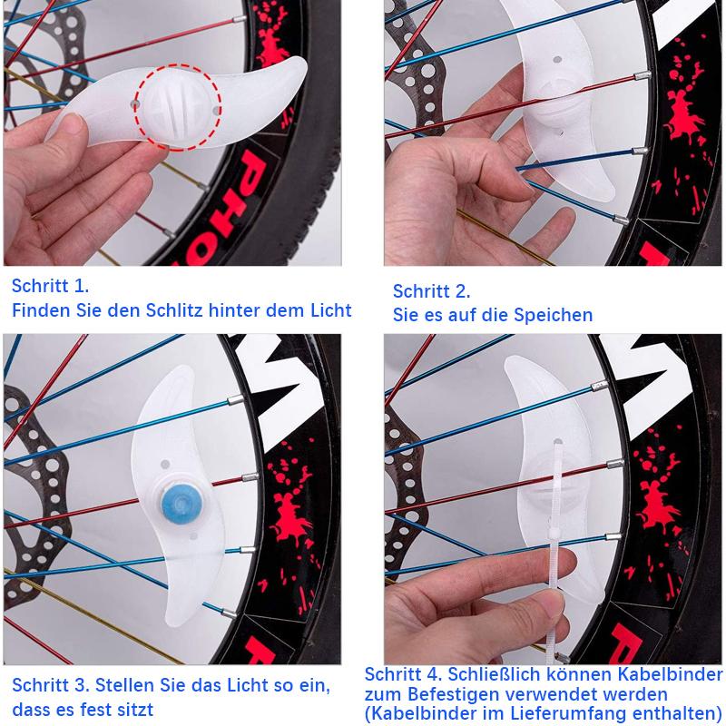 【EINFACHE INSTALLATION】 - Sehr einfach zu installieren und direkt nach dem Auspacken zu bedienen. Rasten Sie sie einfach direkt auf Ihre Fahrradspeichen ein und schalten Sie das Licht ein, indem Sie die einzige Taste am Gerät drücken. Wenn Ihre Fahrradspeichen dicker als normale Straßenreifen sind, können Sie sie mit Kabelbindern sichern, um sie stabil zu machen. Geeignet für die meisten Φ2mm Speichen.