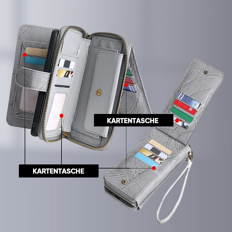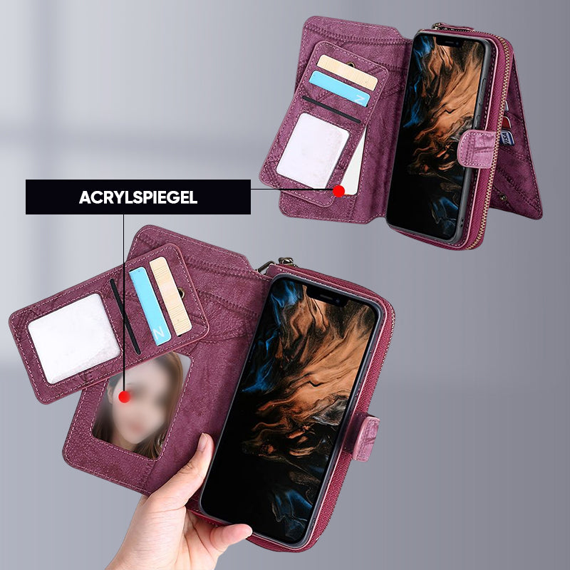 Design: 14 Kartenfächer, 3 Geldfächer, 1 Geldbörse mit Reißverschluss
