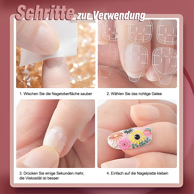 Um die Lebensdauer des Nagelpflasters zu verlängern und Kosten zu sparen, enthält jedes Paket professionellen Gelkleber (24 STÜCKE), den Sie auch kaufen können. Entfernen Sie einfach den auf den Nägeln verbliebenen Gelee-Kleber und Sie können das Nagelpflaster wieder verwenden.