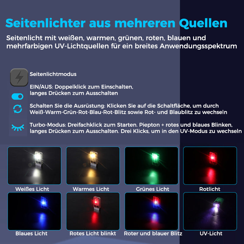 ღ Auf der Suche nach einer multifunktionalen Taschentaschenlampe ❤ Diese Taschenlampe hat einen Magneten an der Unterseite zur einfachen Befestigung und unterstützt auch Schlüsselanhänger. Es stehen außerdem verschiedene Seitenlichter zur Auswahl (weiß, rot, grün, blau, gelb) und bieten die Modi Rotlichtblinken, Rotlicht und Blaulichtblinken.