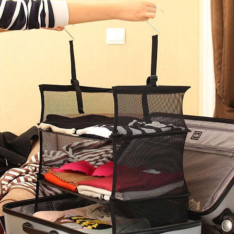 Packen Sie es einfach in eine Reisetasche und stecken Sie es in Ihr Gepäck. Wenn Sie es brauchen, packen Sie es aus und verwandeln es in einen Lagerregalhalter mit drei Schichten.