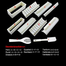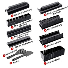 Das Kit enthält 5 Formen, mit denen Sie ganz einfach Sushi in 5 verschiedenen Formen herstellen können: