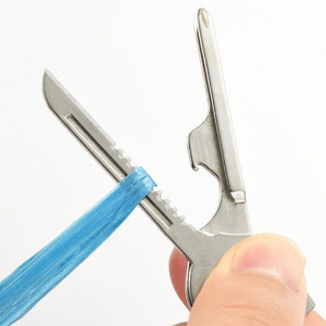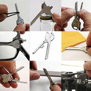 Das 6-in-1-Schlüsselringwerkzeug ist ein leichtes selbsthemmendes Werkzeug, das sicher an Ihrem Schlüsselring befestigt wird. Es verfügt über einen flachen Schraubendreher, einen Flaschenöffner, einen Kreuzschlitzschraubendreher, gezahnte und gerade Messerklingen sowie einen Mikro-Brillen-Schraubendreher. Es ist kompakt und bequem zu bedienen.