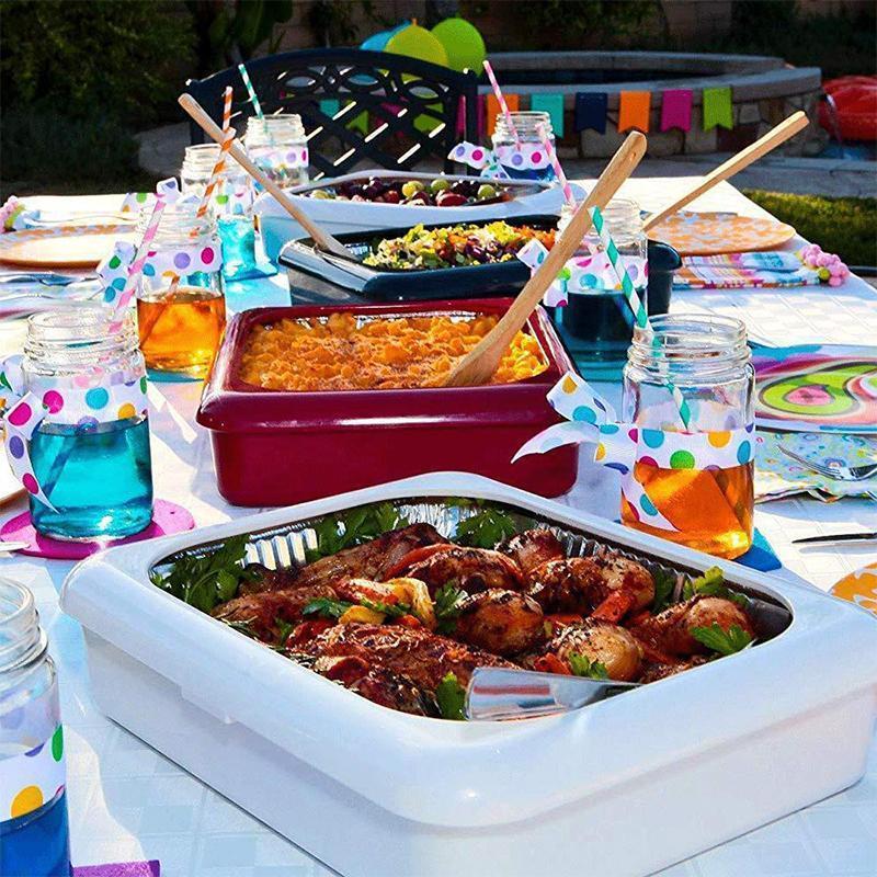- Die Alufolie Aufbewahrungsbox verschönert Ihre Einweg-Folienschale, damit sie auf Ihrem Tisch, bei BBQs, Potlucks, Picknicks, Catering, Büropartys, Feiertagsveranstaltungen und vielem mehr immer gut aussieht.
