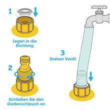 Der Schlauch wird an der rechten Ecke des Regenbogens eingehängt und Wasser tritt aus dem transparenten Wasservorhang aus.