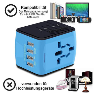 Universal World Plug Reiseadapter Travel Plug Converter mit 4 USB für alle Länder. Durch diesen universellen Weltstecker haben Sie die Garantie in mehr als 150 Ländern, dass Ihre Ausrüstung aufgeladen wird, einschließlich England UK - Amerika USA - Australien - Asien - Südamerika - Afrika.