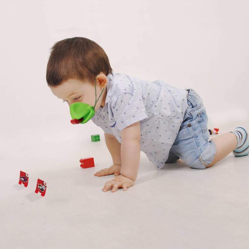 - Blasen Sie durch den Schlauch in der Maske, um die Zunge herauszuschieĂen.