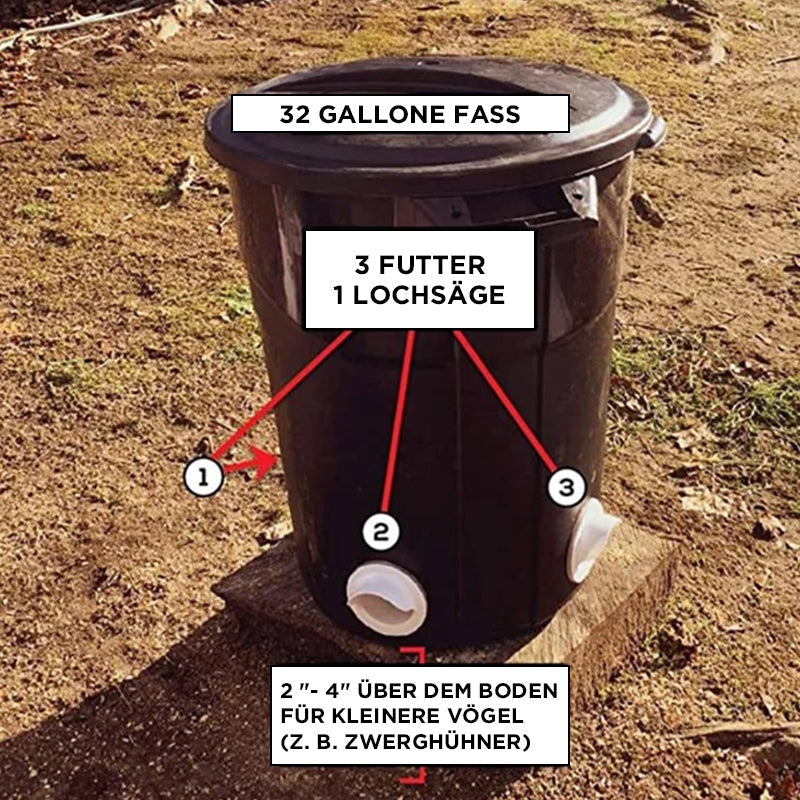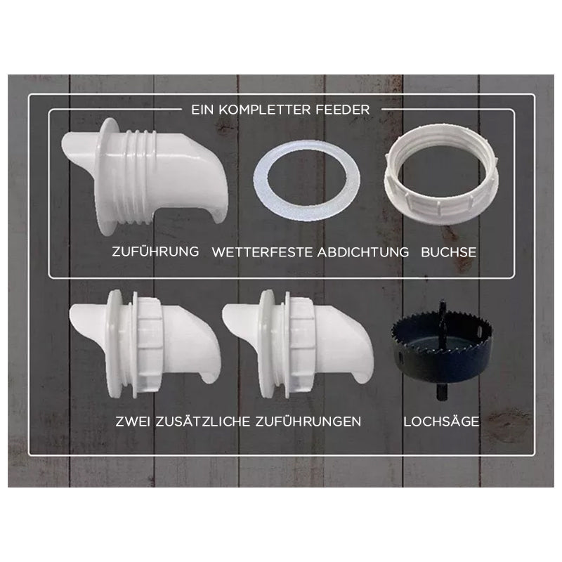 Einfach zu installieren, mit einer 80-mm-Lochsäge ausgestattet, stellen Sie in einer Minute einen Hühnerfutterspender für den Außenbereich her.
