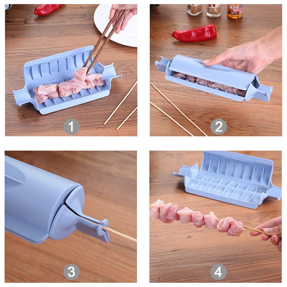 🐠♦ Öffnen Sie den Schnellspießmaschine, dann legen Sie Ihre fertig zubereiteten Speisen in das Tablett, so weit wie möglich in der Mitte in der Nähe der Durchgangsrille. Platzieren Sie Ihre Zutaten einfach in das Plastikfach, schließen Sie es und führen Sie den Metallspieß in die Öffnung ein, und fädeln Sie ihn ein auf der anderen Seite. Schließen Sie den Spießhersteller und halten Sie ihn, drücken Sie den Spieß durch das Loch im Spießhersteller. Einfachheit, Schnelligkeit, Sicherheit, Energie, Gesundheit, geeignet für alle Arten von Stahlschild Bambus-Stick für Grill hervorragende Hilfsmittel