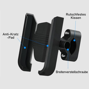 STABIL UND SICHER- Drehen Sie die seitlichen Schrauben wie empfohlen, um Ihr Telefon festzuhalten. Die Gummistreifen schützen Ihr Telefon und den Lenker vor Kratzern.