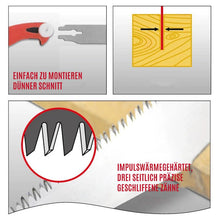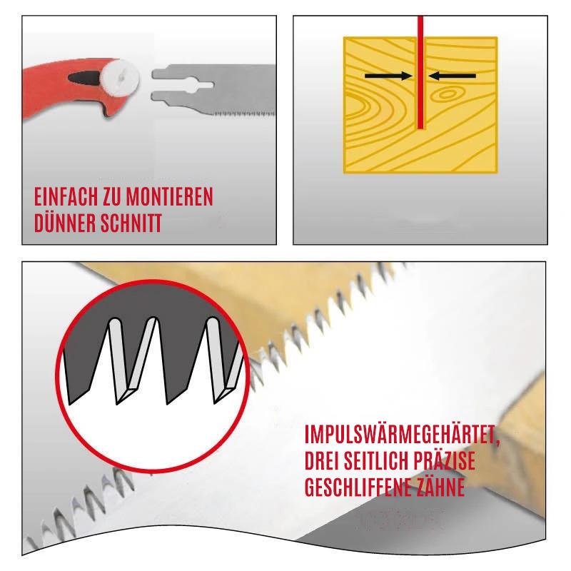 Dünne Klinge - kein Festkleben mitten im Schnitt, besonders beim Schneiden von dicken Hölzern.