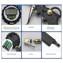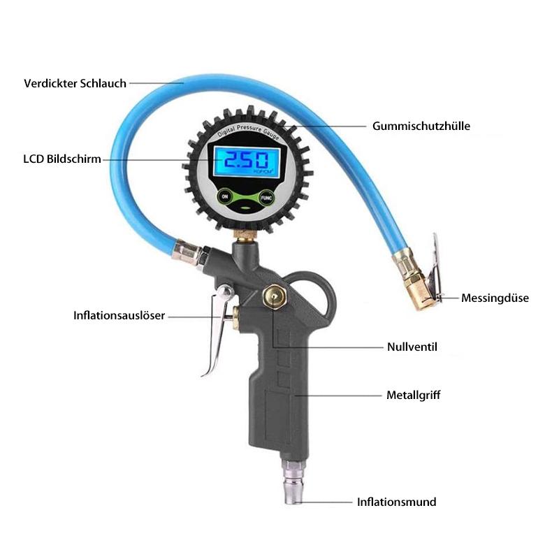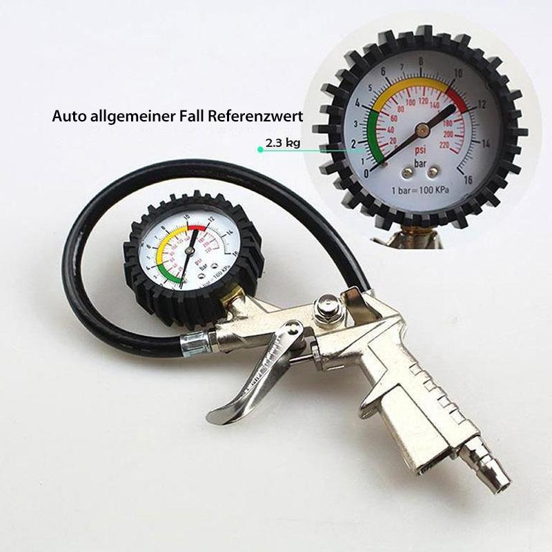 Das Reifendruckmessgerät hat die Funktion, die Reifen zu entleeren, aufzupumpen und zu testen, und eine Luftpumpe kann an den Fahrzeugmotor angeschlossen werden, um eine Staubblasfunktion zu haben.