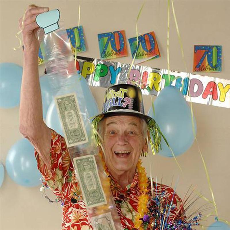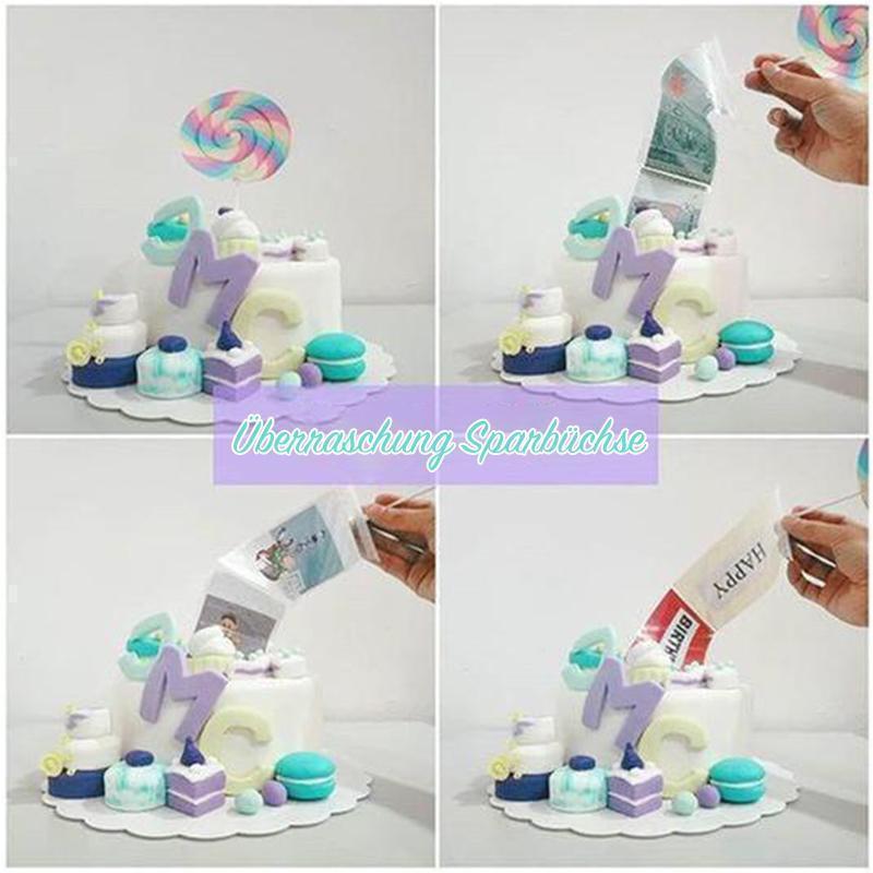 Verstecken Sie ein zusammengerolltes Geldgeschenk in dieser Dekorationsbox. Legen Sie es in Ihren Geburtstagskuchen und während der Empfänger das Happy Birthday-Schild oder die Kerze oben anhebt, entfalten sich das Geld oder die Fotos!