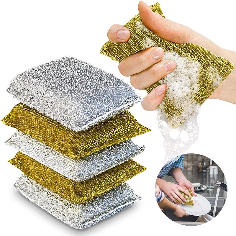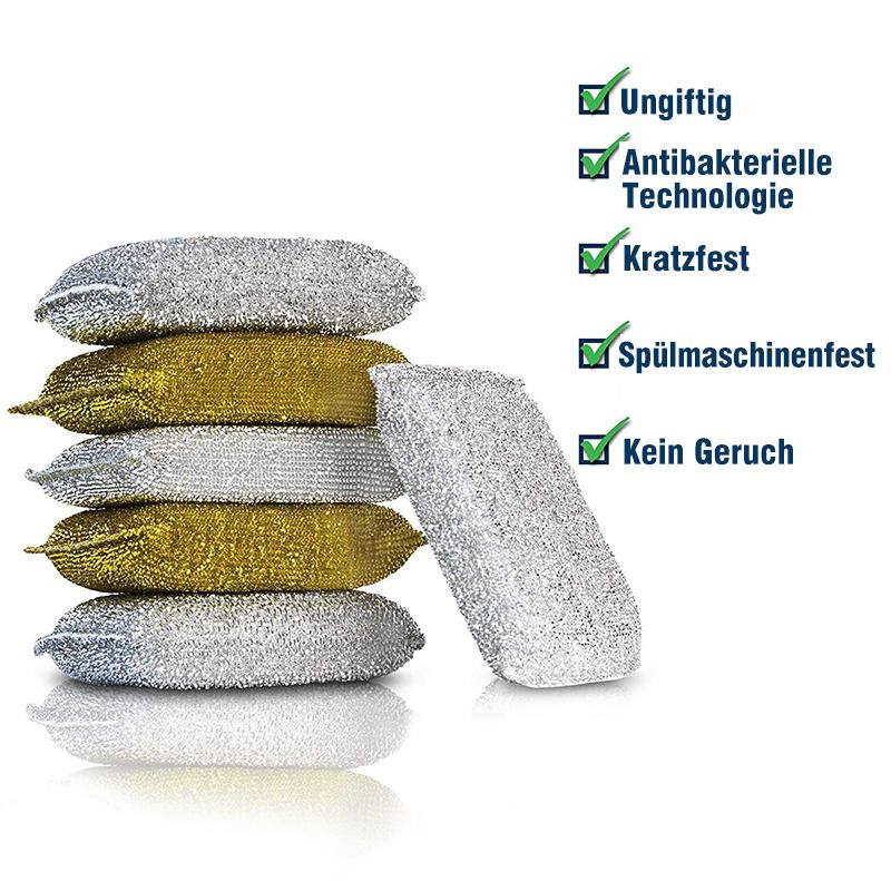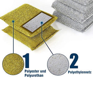 Diese Reinigungsschwämme bestehen aus metallischem Polyester über einem dicken, saugfähigen Schwamm, um Töpfe und Pfannen auf einen brillanten Glanz zu polieren. Die Matten sind antibakteriell, rosten nicht und reinigen jedes Mal kräftig und kraftvoll. -