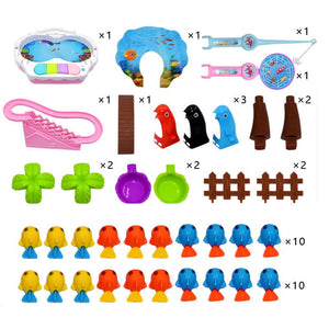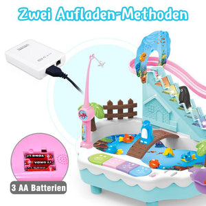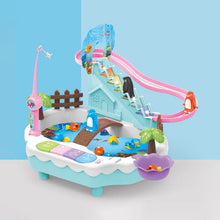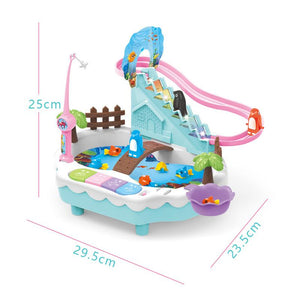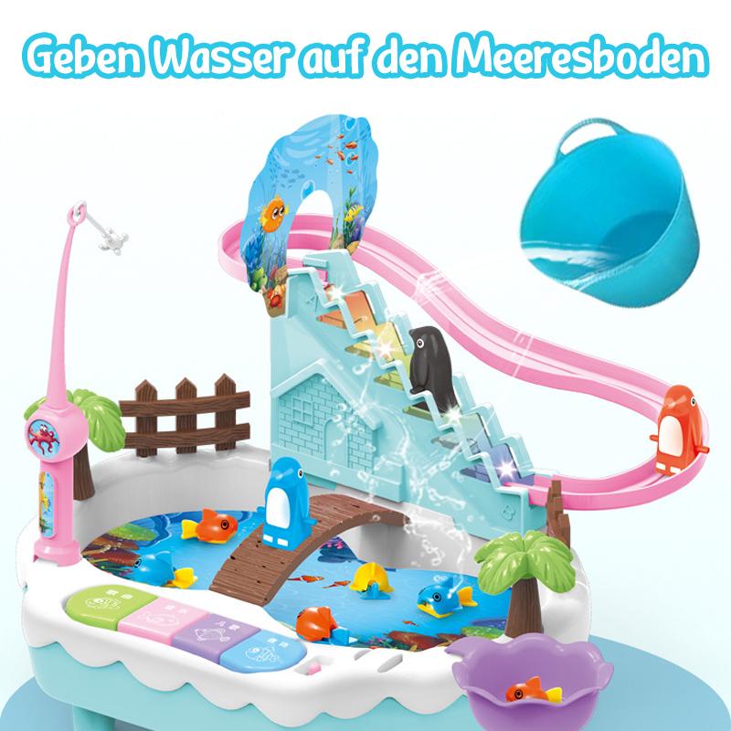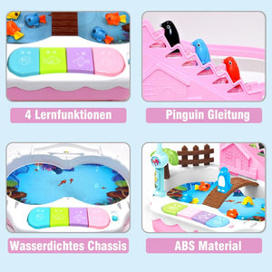 Der kleine Pinguin, der mit dem Pinguin-Gleitspiel verbunden war, stieg die Treppe hinauf und rutschte dann sehr interessant von der Strecke herunter.