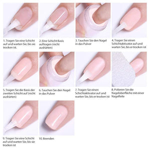 Dieses Nails Dip Powder Starter Kit ist professionell ohne schädliche Chemikalien formuliert und enthält nanobindende Partikel, die verhindern, dass es abplatzt, sich verfärbt und anhebt.