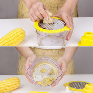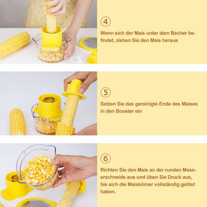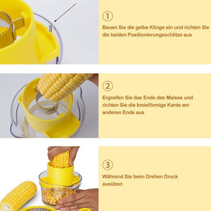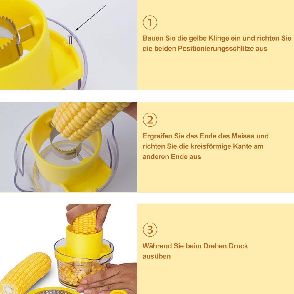 - Richten Sie den Mais an der runden Messerschneide aus und üben Sie Druck aus, bis sich die Maiskörner vollständig gelöst haben.