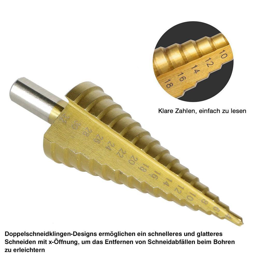 - TITANIUM-BESCHICHTUNG: Dieser mit Titan beschichtete Stufenbohrersatz bietet eine gute Beständigkeit gegen Hitze, Korrosion und Rost.