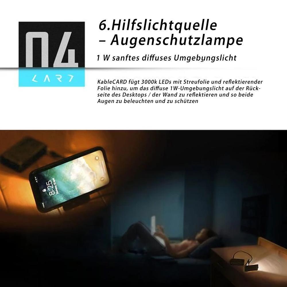 - Schalten Sie einfach die KableCARD-Karte ein, um die Telefonhalterfunktion in einen Telefonhalter umzuwandeln, sodass Sie Filme bequem kabellos aufladen, ansehen, füllen und mitnehmen können. Zusätzliche Lichtquelle - Umgebungslicht Wir haben einen dreistufigen Schalter für KableCARD mit einer diffusen Folie und einer reflektierenden Folie entworfen, die 1 W weiches diffuses Licht auf einen Tisch oder eine Wand reflektiert, um effektives polarisiertes Licht zum Schutz Ihrer Augen zu erzeugen.