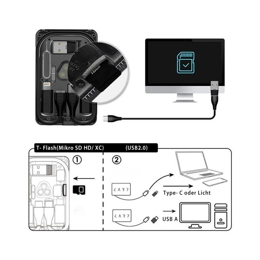 - Nicht nur das Ladekabel KableCARD verfügt über 1 eingebauten Kartensteckplatz und 2 Speicherkartensteckplätze. Es ist praktisch, die WLAN-Karte auszutauschen und die Ersatz-SIM-Karte aufzubewahren. Wenn Sie ins Ausland oder auf Geschäftsreise reisen, müssen Sie sich keine Sorgen mehr machen, dass Sie Ihre Karte und Ihre SIM-Karte verlieren.