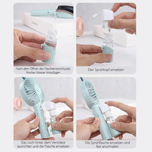- ★ Neues Nebeldesign - Genießen Sie ein anderes Kühlerlebnis, indem Sie den Sprühknopf manuell drücken, während Sie den Lüfter verwenden. Nehmen Sie die Flasche heraus und fügen Sie Wasser, Gesichtswasser, Feuchtigkeitscreme usw. hinzu. Flüssigkeit in der Sprühflasche.
